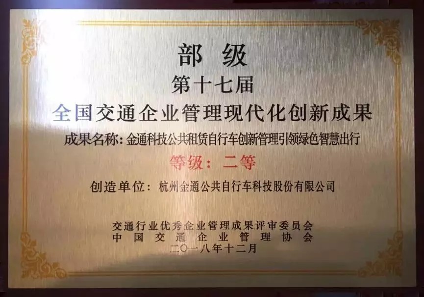 2019年3月14日,中國交通企業管理協會在山東濟南市召開了“第十七屆交通企業管理創新年會”。會上公布了第十七屆全國交通企業管理現代化創新成果和示范單位,并對獲獎單位和主創人進行了授牌,金通集團提交的《金通科技公共租賃自行車創新管理引領綠色智慧出行》榮獲第十七屆全國交通企業管理現代化創新成果二等獎。